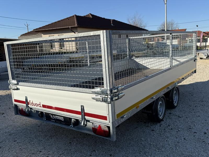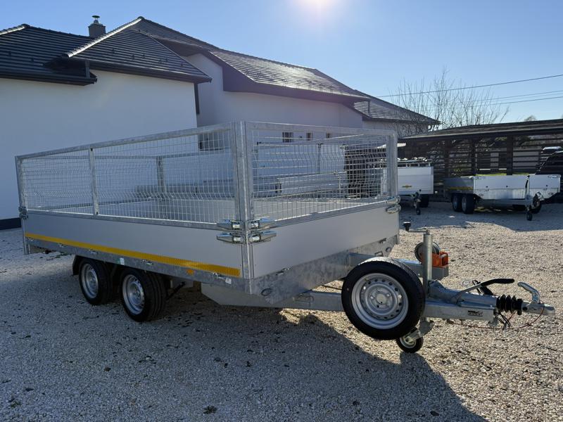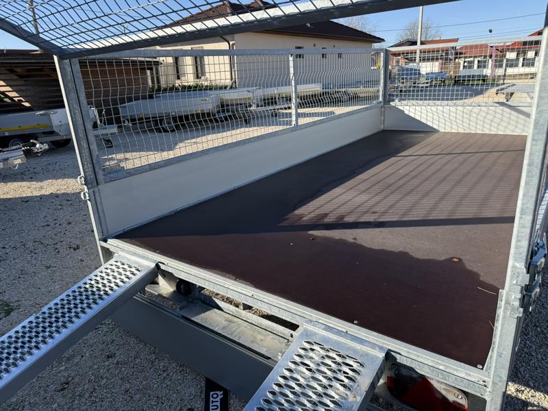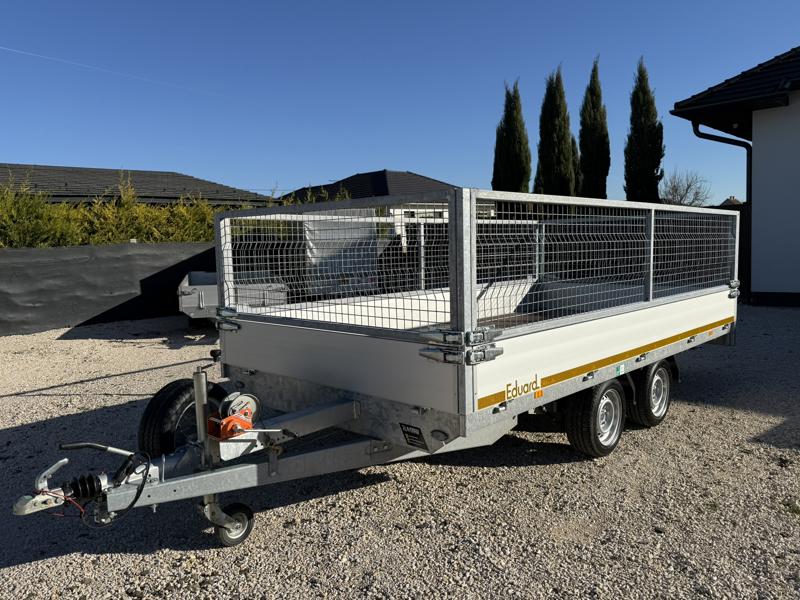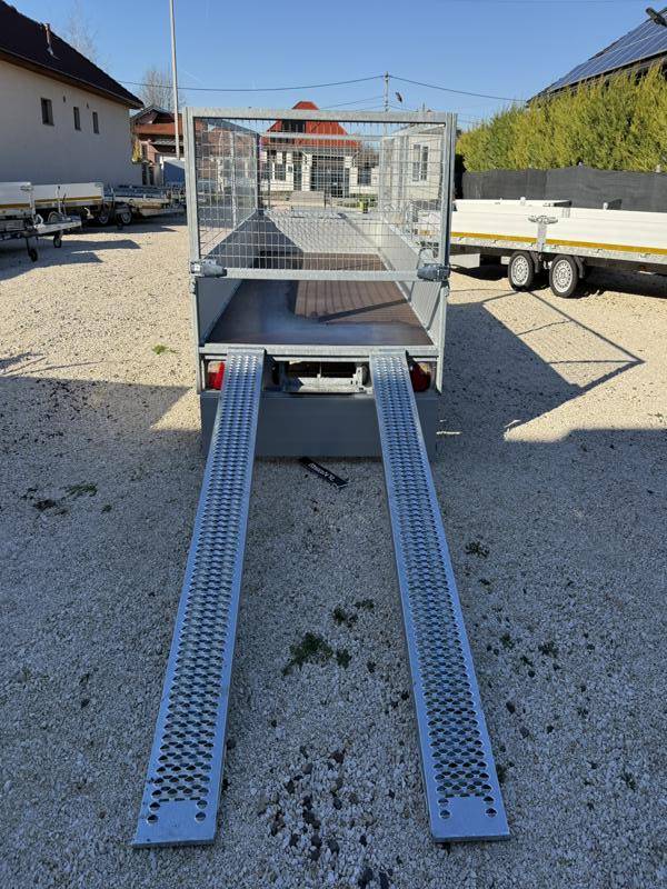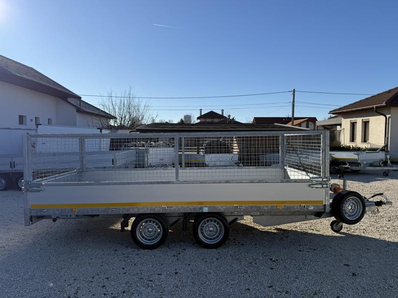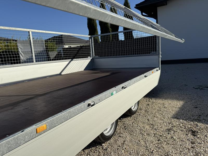 Perem nélküli, sík platós, fa csúszásmentes rétegelt lemezzel borított, trailer, univerzális utánfutó, multitransporter pótkocsi, 30 cm-s eloxált duplafalú alumínium lenyitható, levehető, rugós, csatos, feszítő retesz záras oldalajtókkal, kivehető rakoncákkal, rendszám mögötti rejtett fiókban lévő acél felhajtó rámpákkal, csörlőtartó konzollal, gyári kézi csörlővel, gyári rácsos magasítóval.