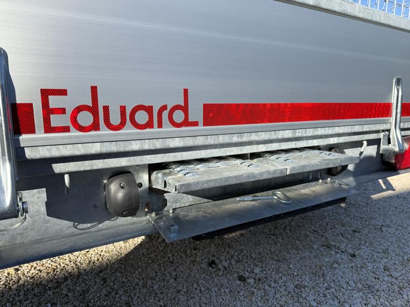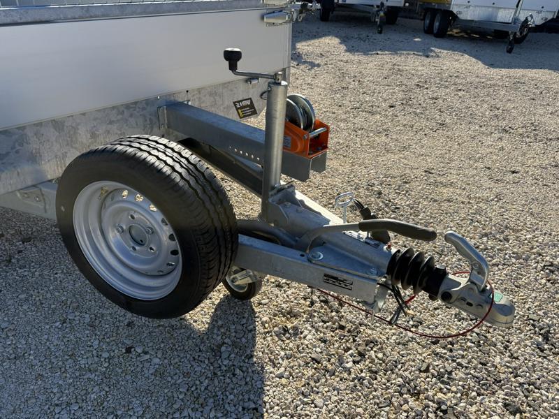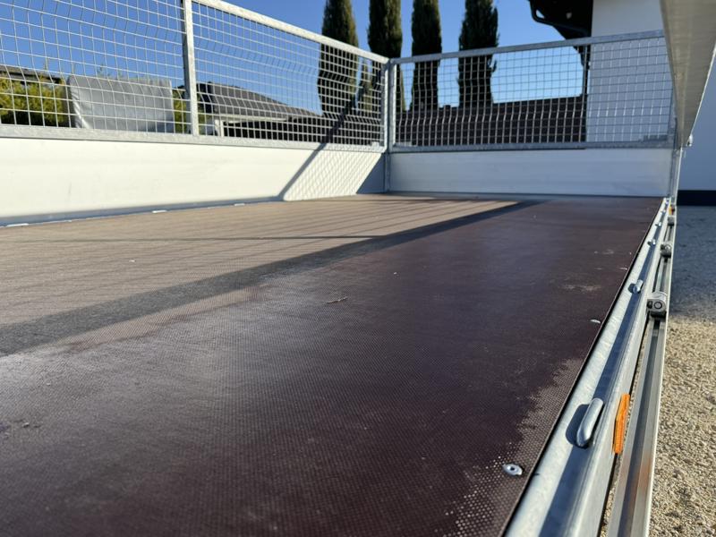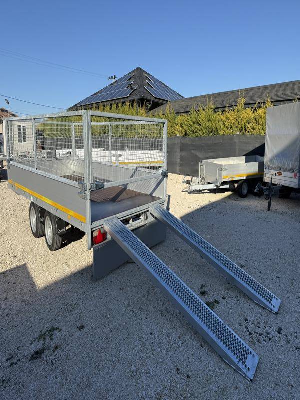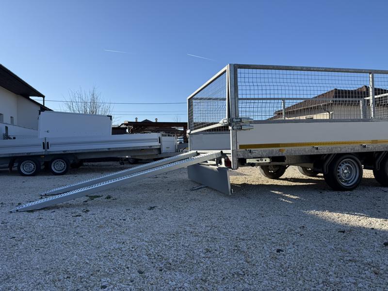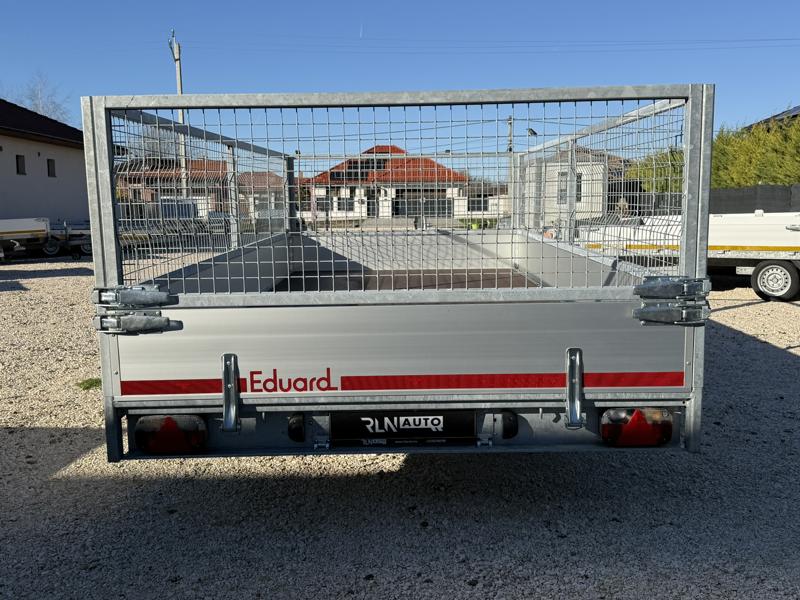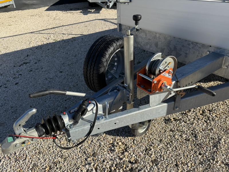Perem nélküli, sík platós, fa csúszásmentes rétegelt lemezzel borított, trailer, univerzális utánfutó, multitransporter pótkocsi, 30 cm-s eloxált duplafalú alumínium lenyitható, levehető, rugós, csatos, feszítő retesz záras oldalajtókkal, kivehető rakoncákkal, rendszám mögötti rejtett fiókban lévő acél felhajtó rámpákkal, csörlőtartó konzollal, gyári kézi csörlővel, gyári rácsos magasítóval.