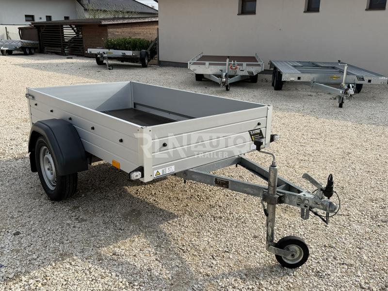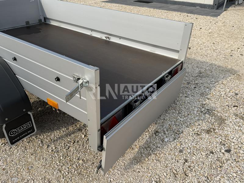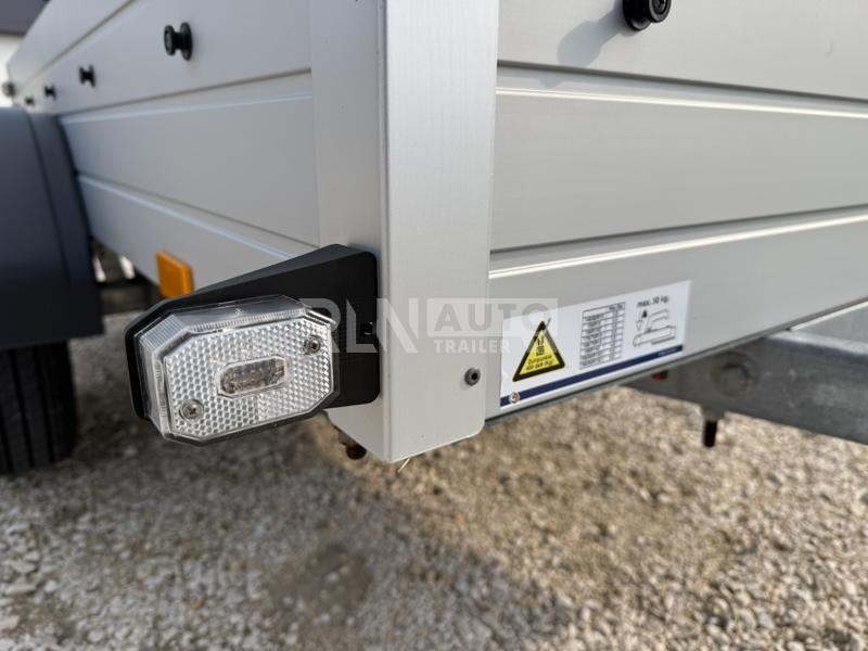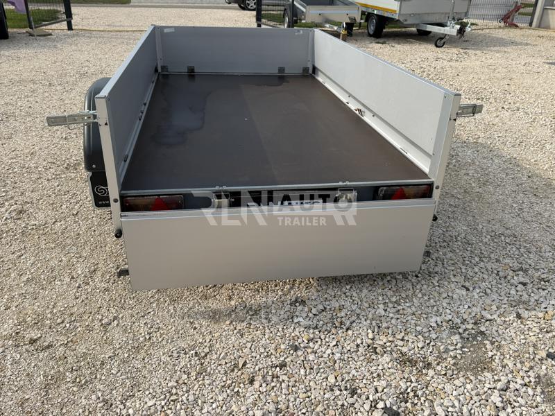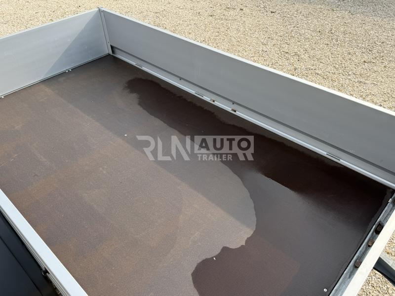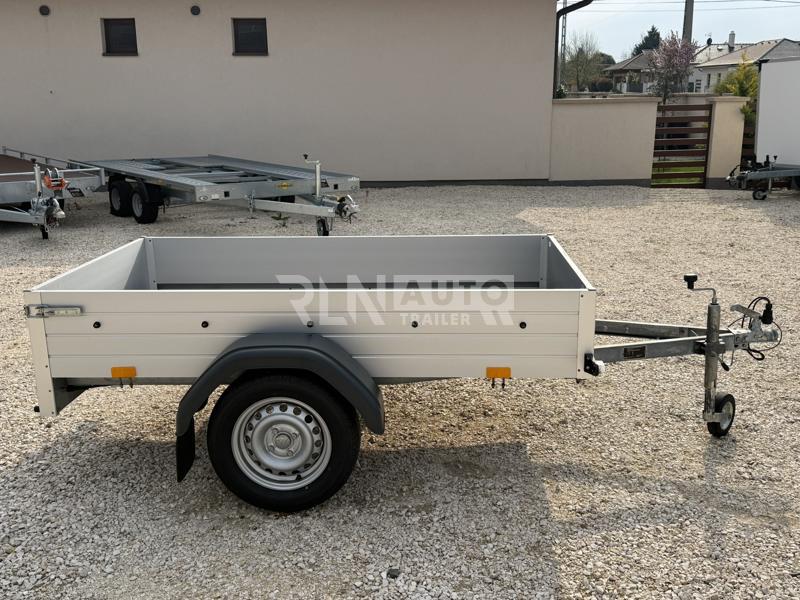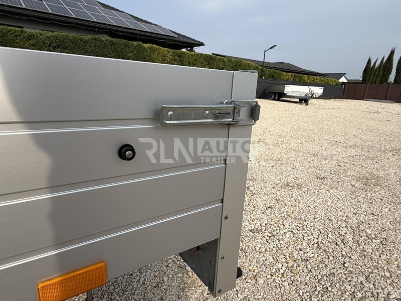 Sík platós, fék nélküli, 33 cm-s alumínium oldalfalú lenyíló hátsó ajtóval, szitanyomott fa csúszásmentes rétegelt lemezzel borított prémium minőségű utánfutó.