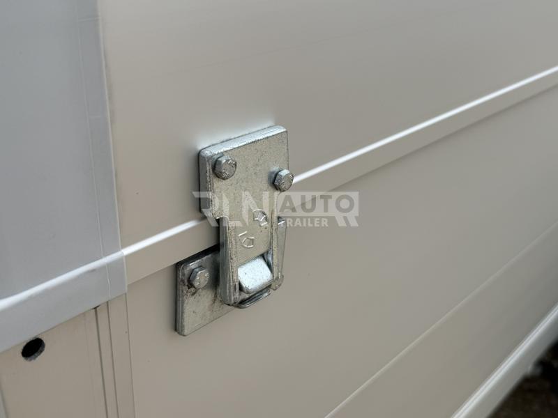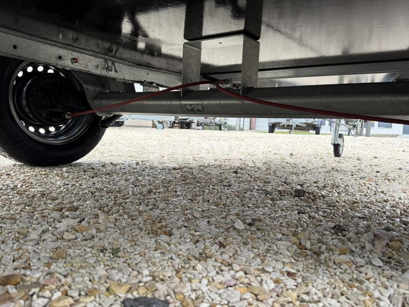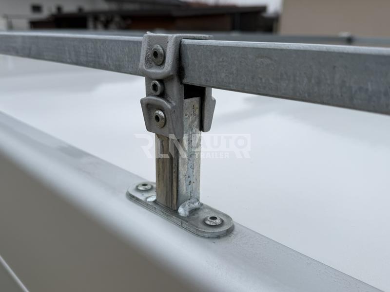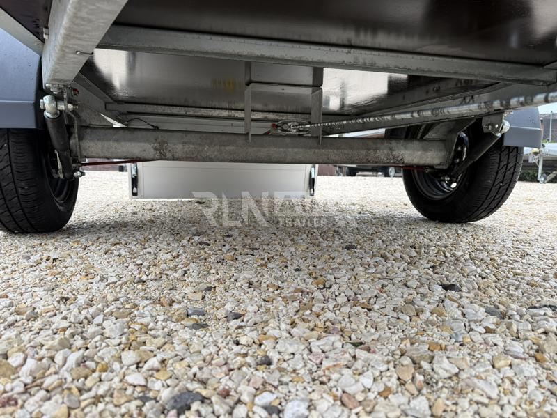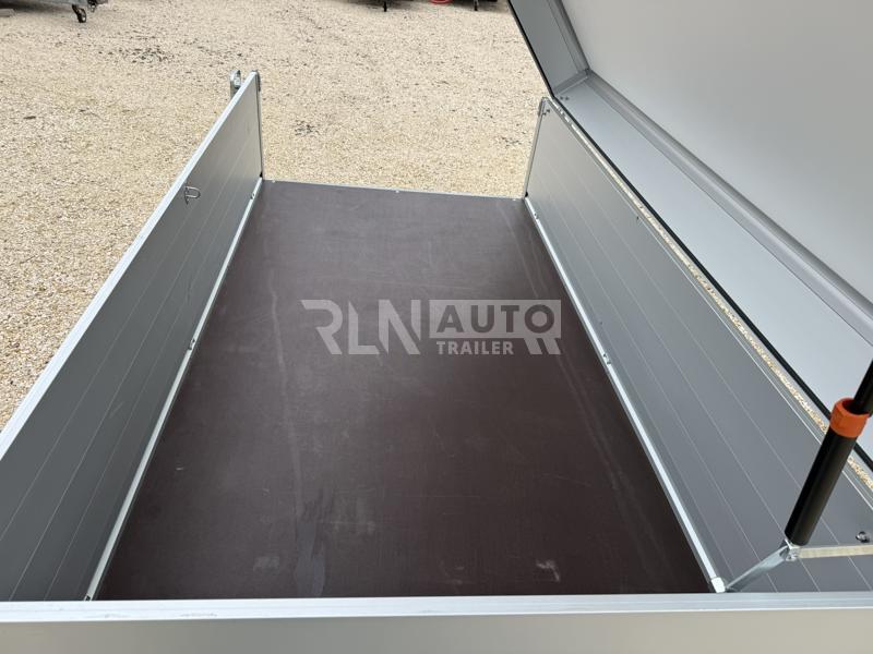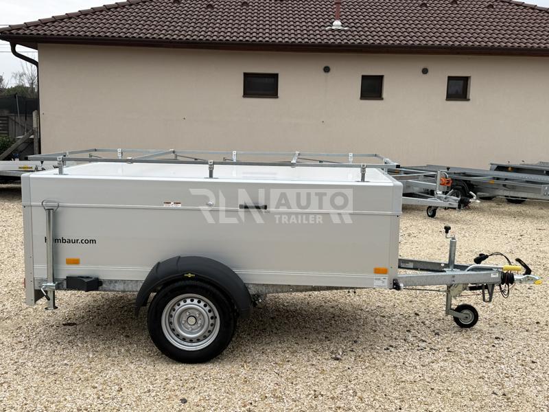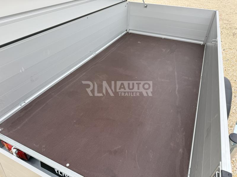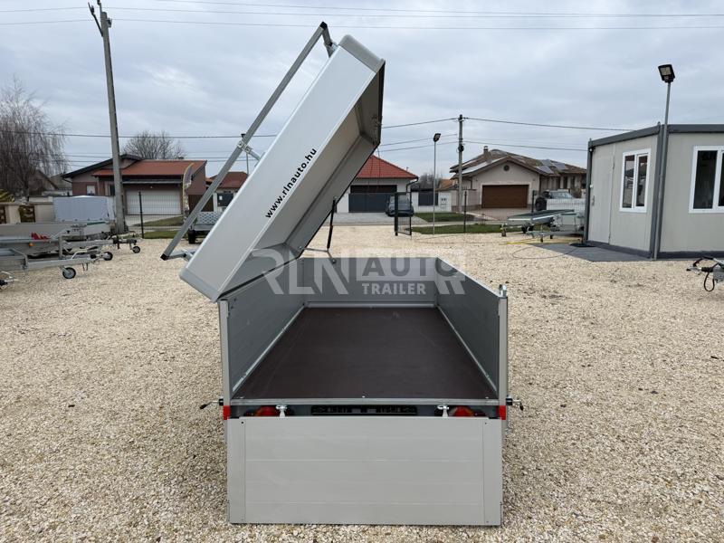 Sík platós, fékes, 15 mm vastag csúszásmentes, szitanyomott padló, vízmentes-, dobozos-, zárt-, zárható utánfutó, jobbra felfelé nyíló alumínium ajtóval. 50cm magas alu oldalfalakkal, 20 cm magas fedéllel, hátsó ajtó lenyitható, levehető. Raktérben mindkét hosszanti oldalon 3-3 db keretprofilba süllyesztett lekötési, rögzítési pontokkal (400 daN/db), 120 kg teherbírású horganyzott acél tetőcsomagtartóval, mely kiválóan alkalmas akár kerékpárszállítók, tetőboxok felszerelésére.