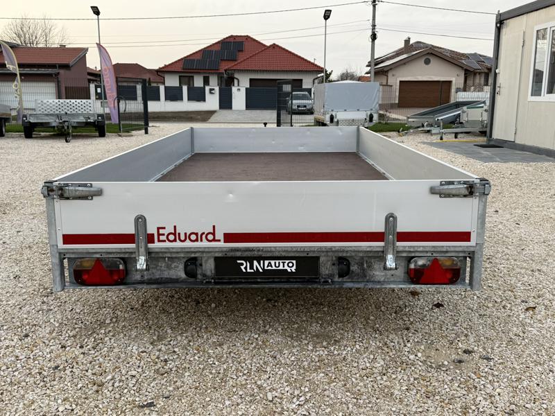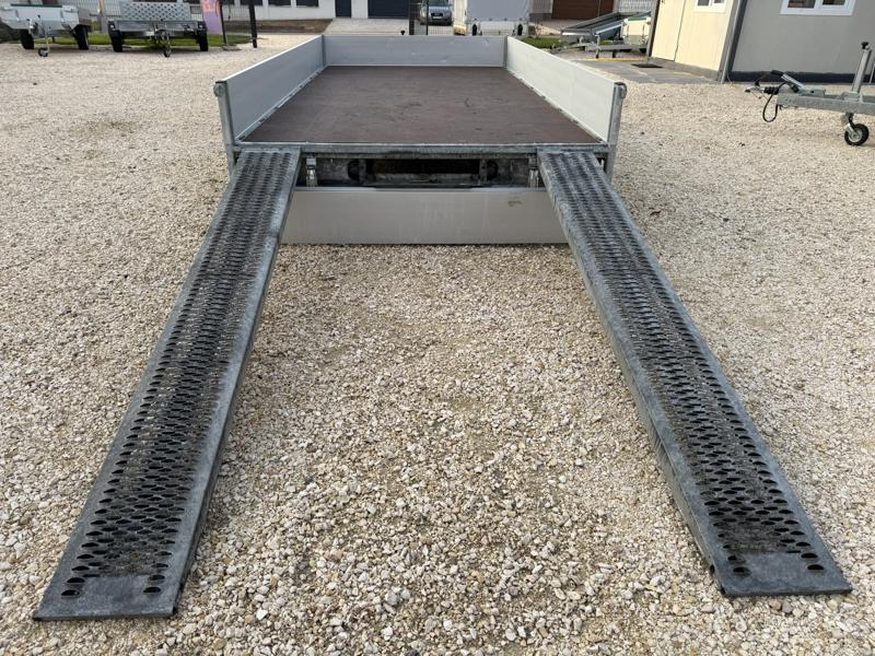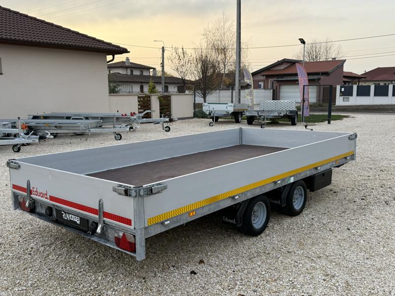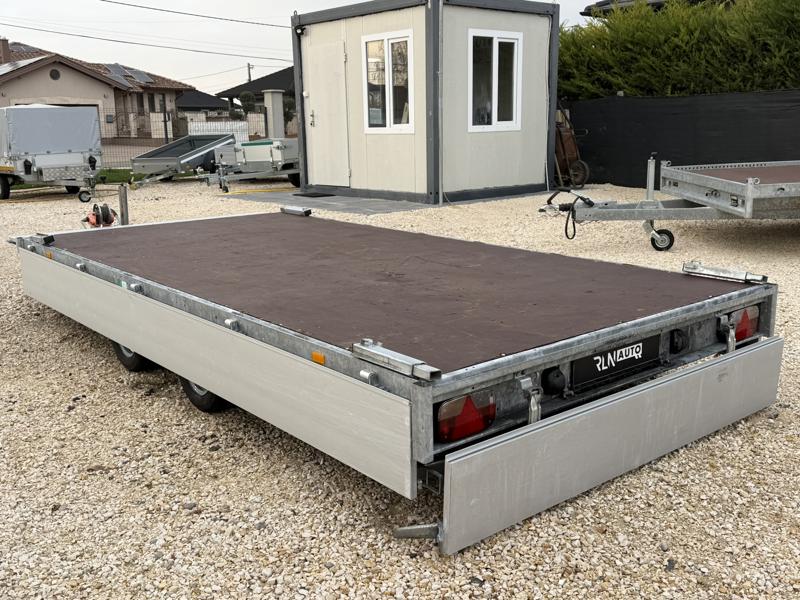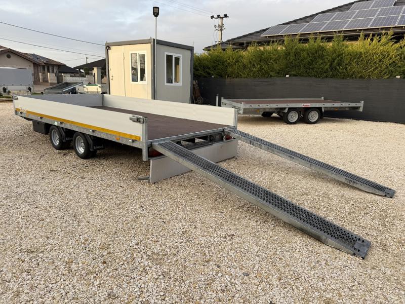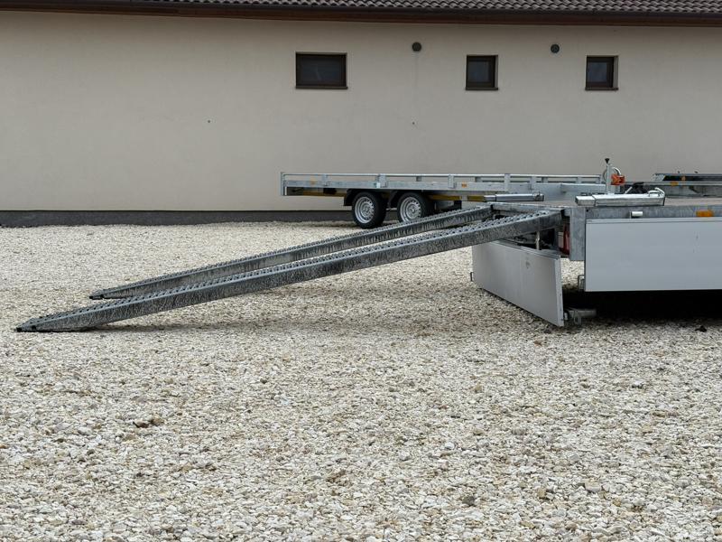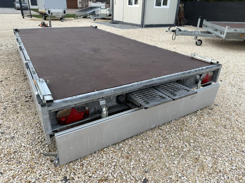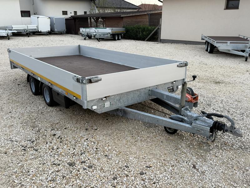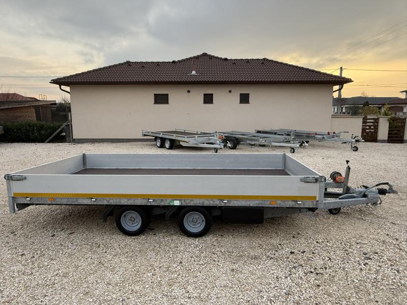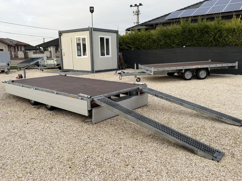 Perem nélküli, sík platós, fa csúszásmentes rétegelt lemezzel borított, trailer, univerzális utánfutó, multitransporter pótkocsi, 30 cm-s eloxált duplafalú alumínium lenyitható, levehető, rugós, csatos, feszítő retesz záras oldalajtókkal, kivehető rakoncákkal, rendszám mögötti rejtett fiókban lévő acél felhajtó rámpákkal, csörlőtartó konzollal, gyári kézi csörlővel.