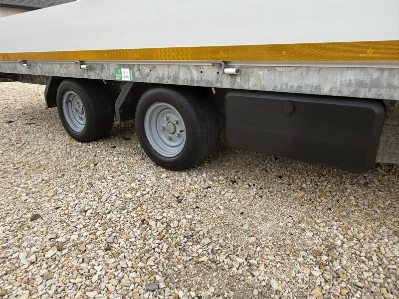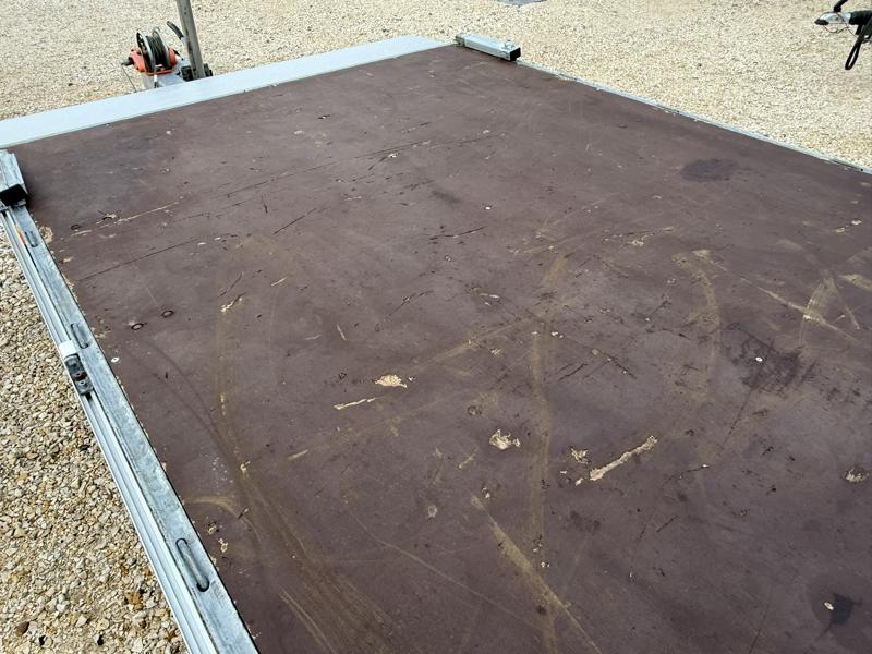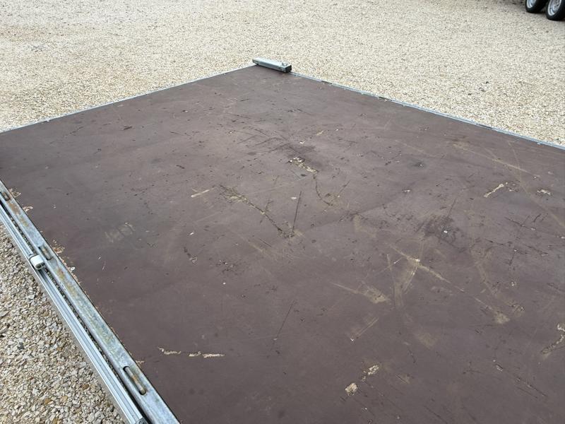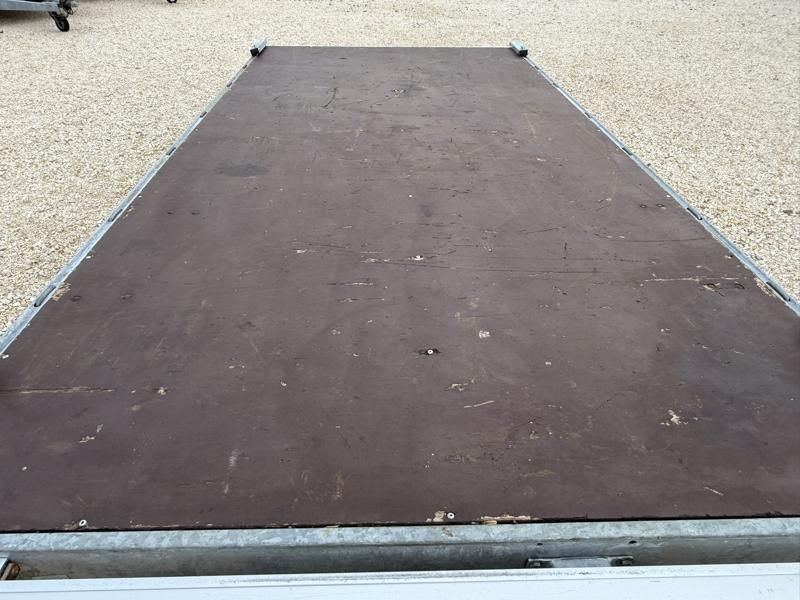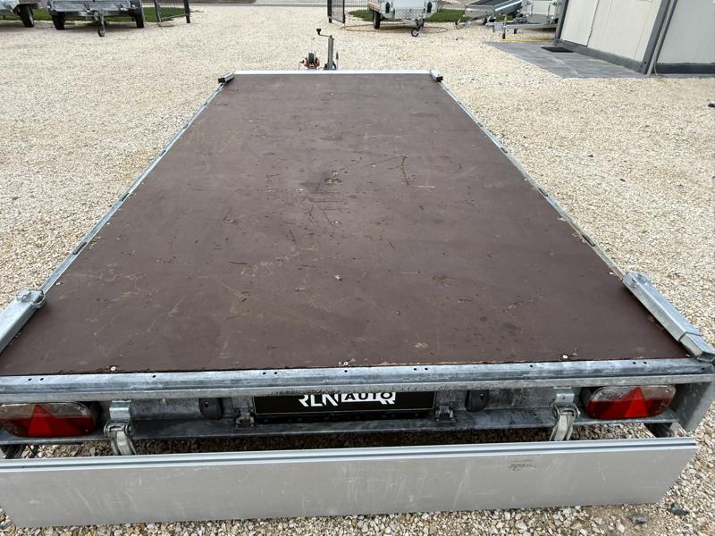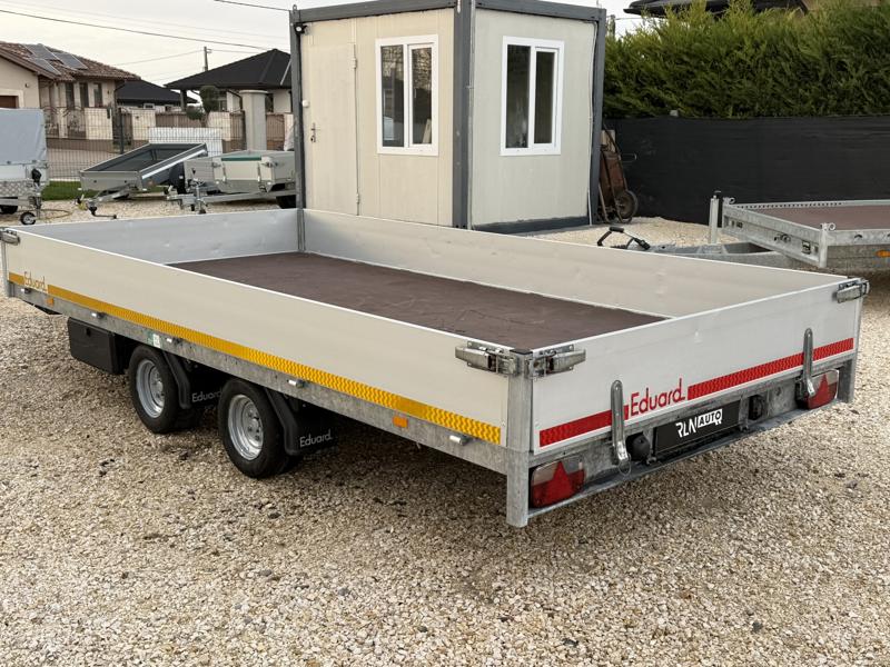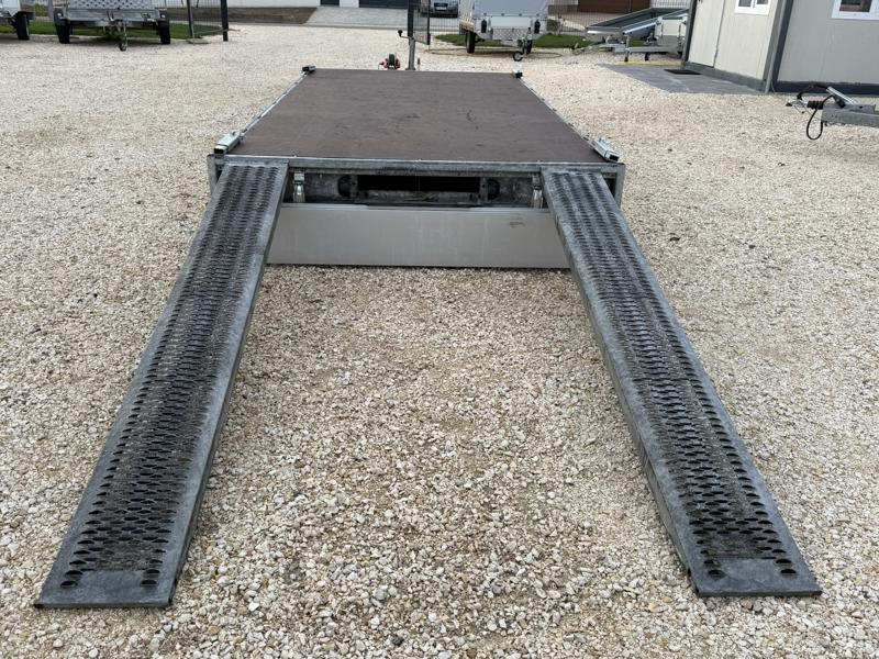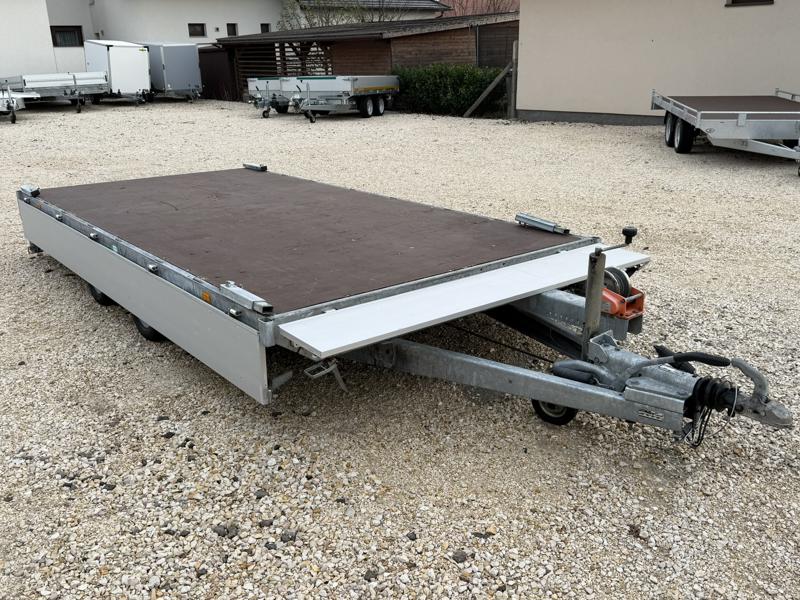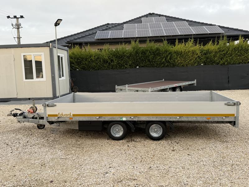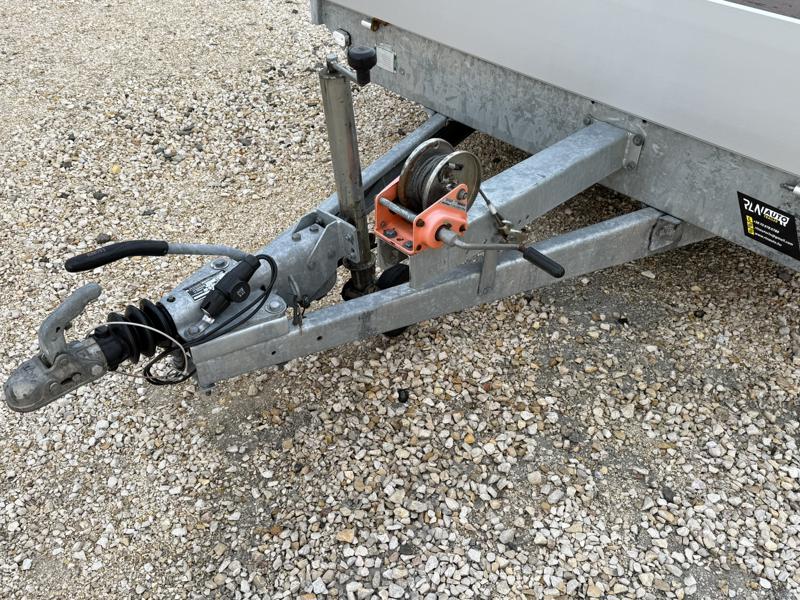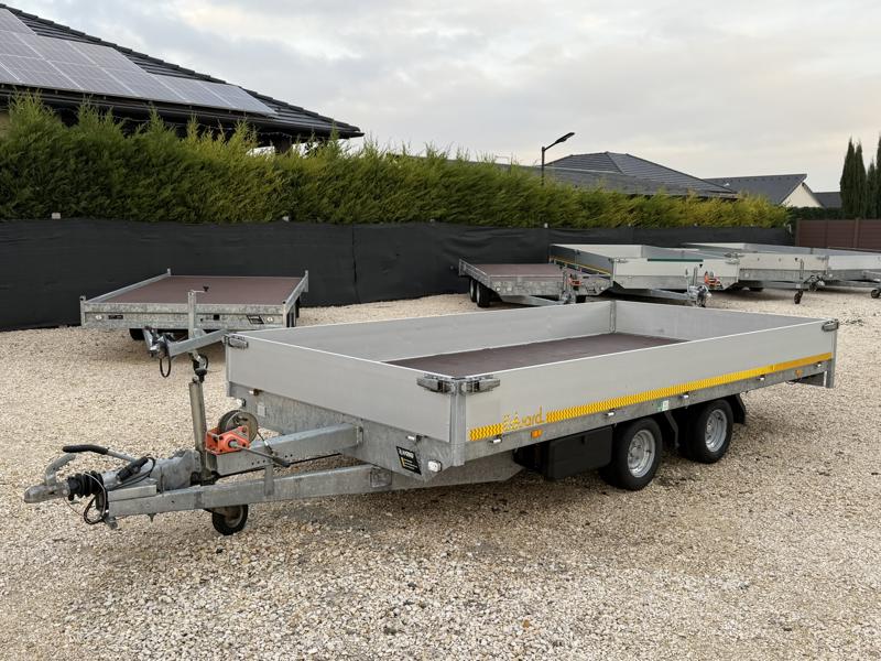 Perem nélküli, sík platós, fa csúszásmentes rétegelt lemezzel borított, trailer, univerzális utánfutó, multitransporter pótkocsi, 30 cm-s eloxált duplafalú alumínium lenyitható, levehető, rugós, csatos, feszítő retesz záras oldalajtókkal, kivehető rakoncákkal, rendszám mögötti rejtett fiókban lévő acél felhajtó rámpákkal, csörlőtartó konzollal, gyári kézi csörlővel.