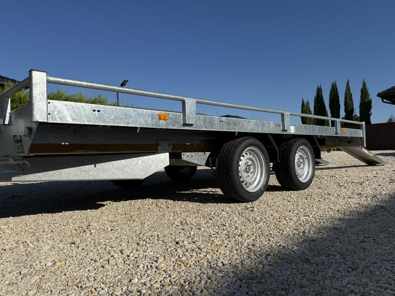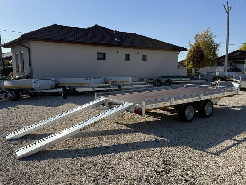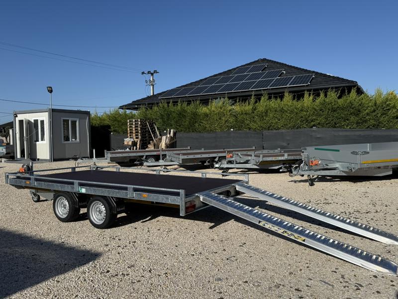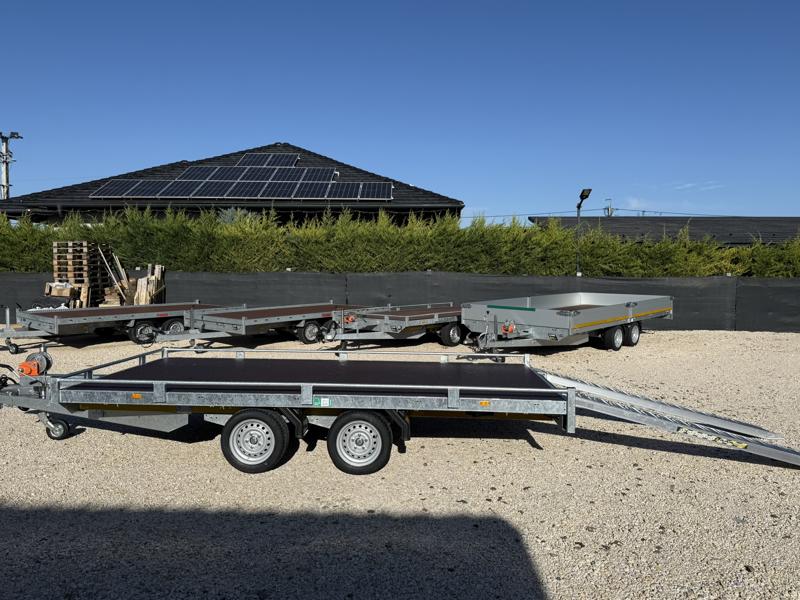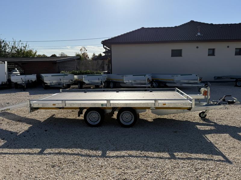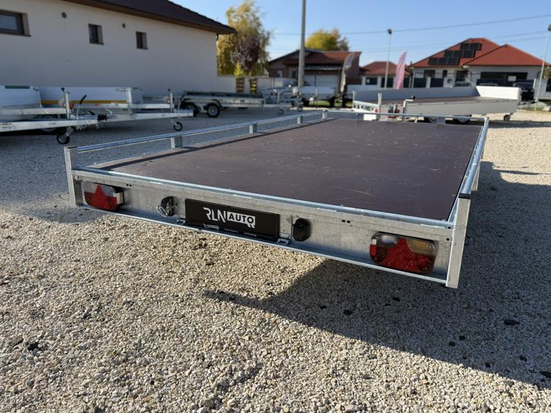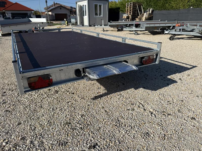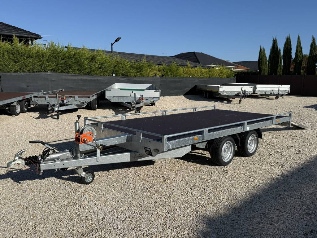 10 cm magas korlátos, sík platós, szitanyomott-, fa csúszásmentes rétegelt lemezzel borított, járműszállító trailer, univerzális utánfutó, gépszállító pótkocsi, rendszám mögötti zárható rejtett fiókban lévő felhajtó rámpákkal, kézi csörlővel.