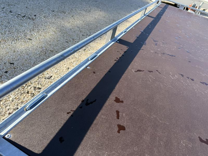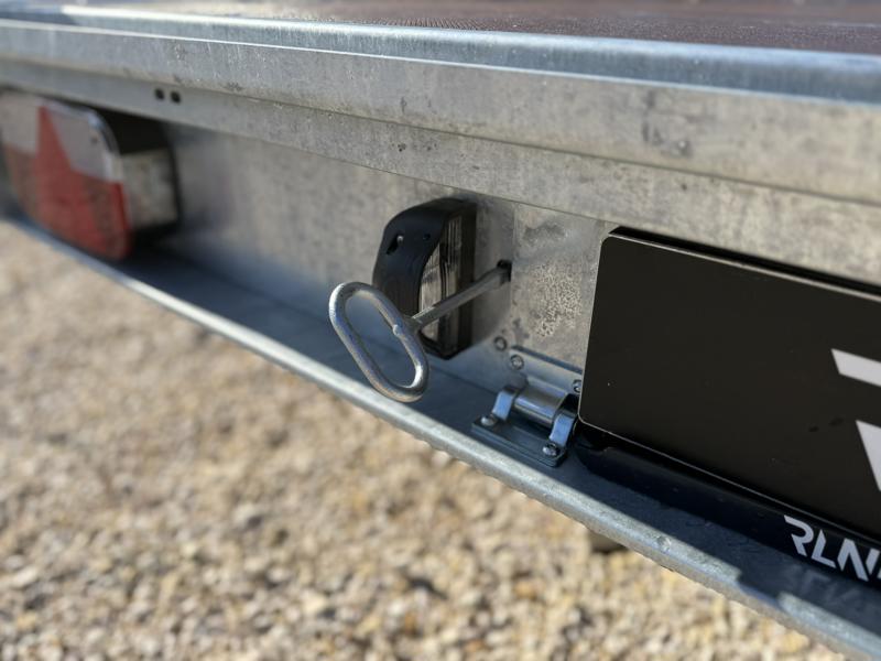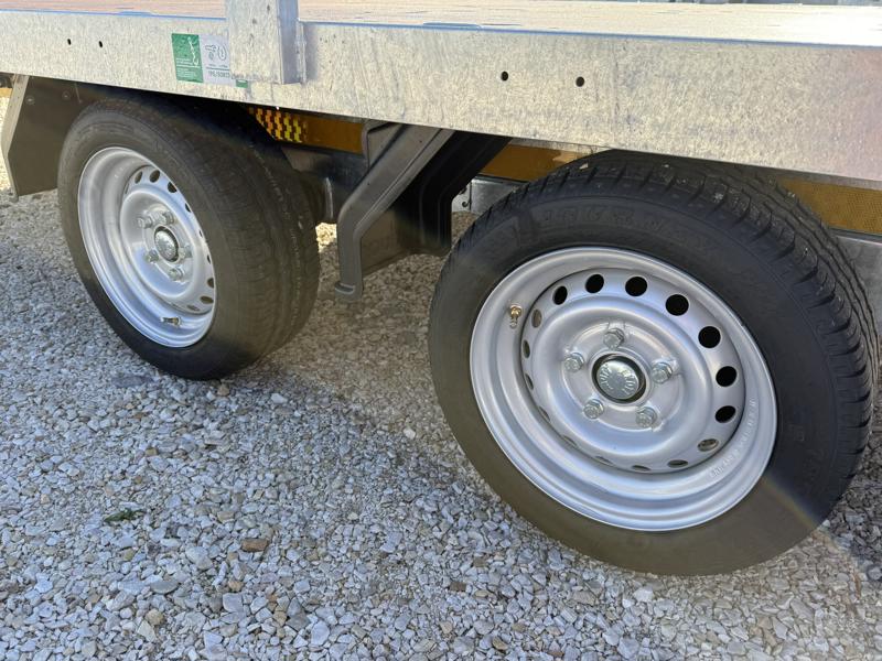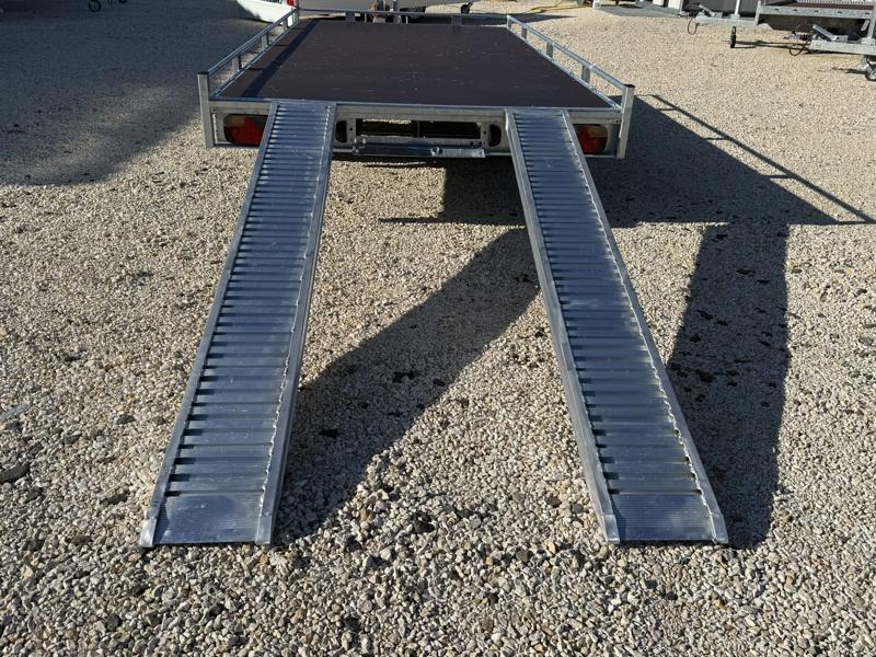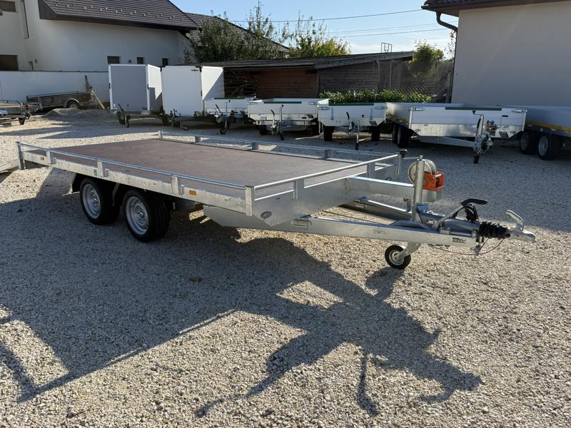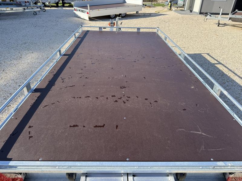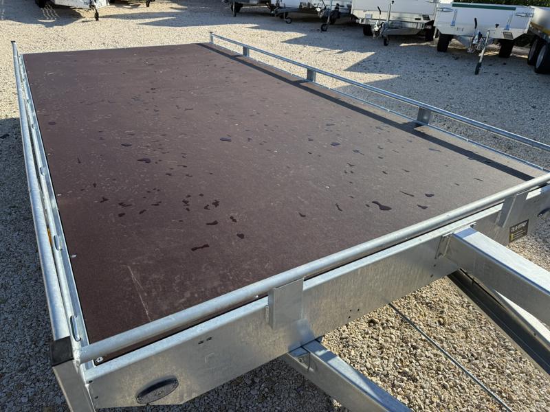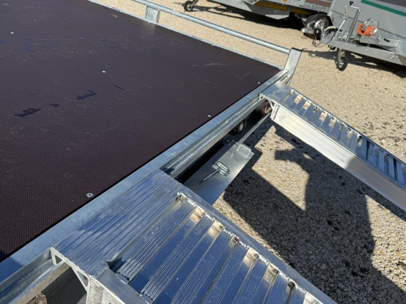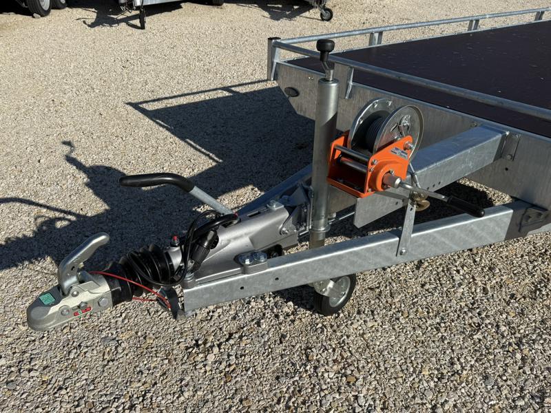 10 cm magas korlátos, sík platós, szitanyomott-, fa csúszásmentes rétegelt lemezzel borított, járműszállító trailer, univerzális utánfutó, gépszállító pótkocsi, rendszám mögötti zárható rejtett fiókban lévő felhajtó rámpákkal, kézi csörlővel.