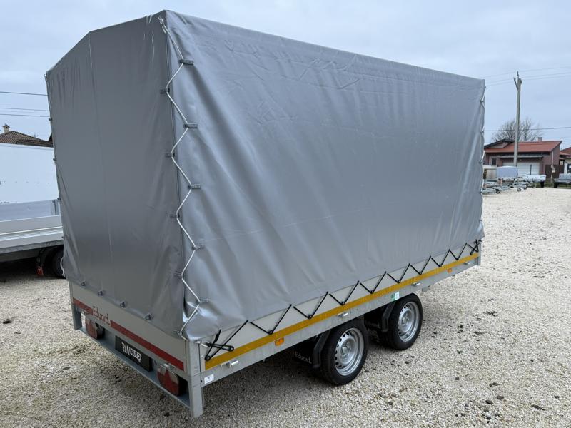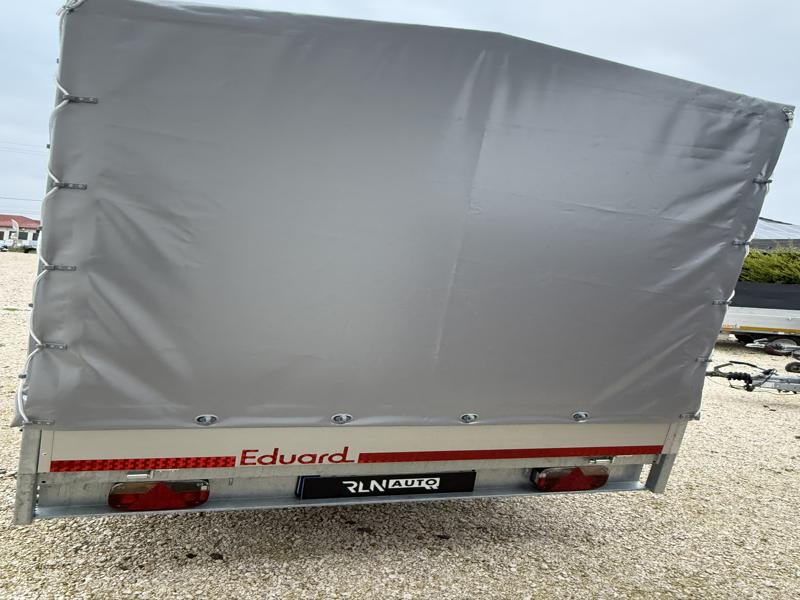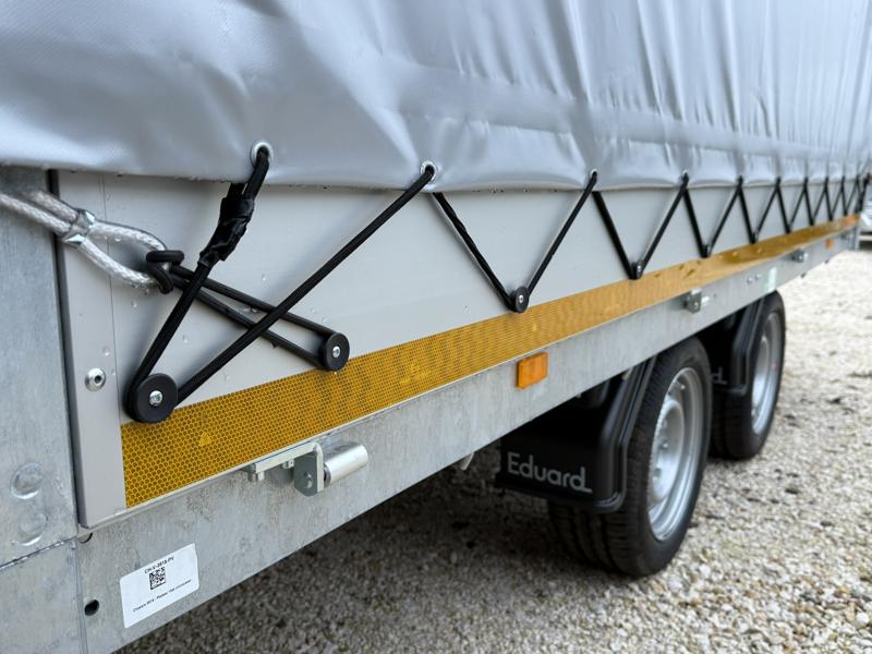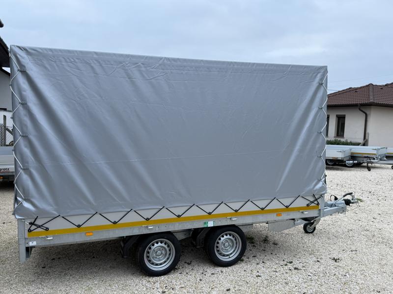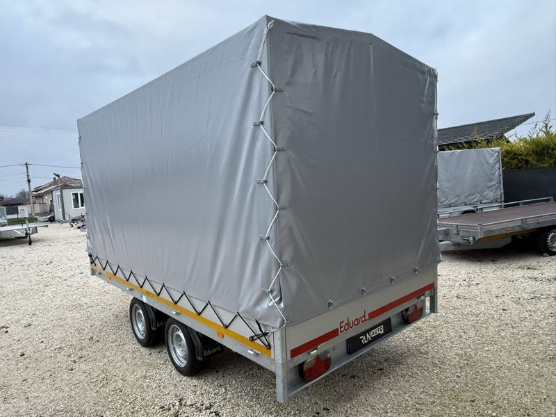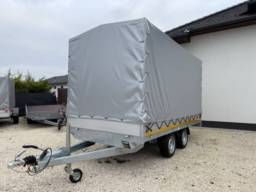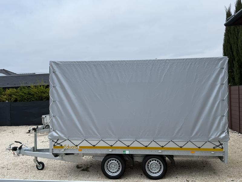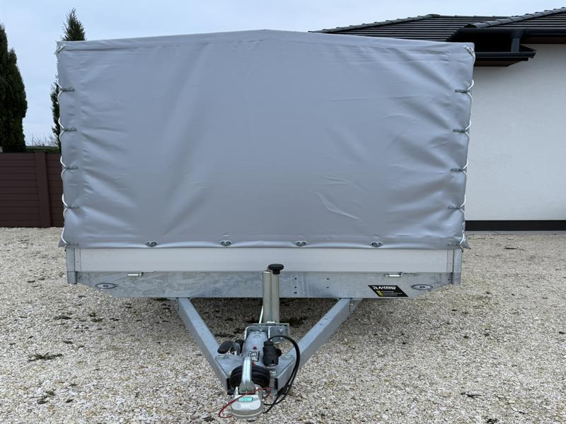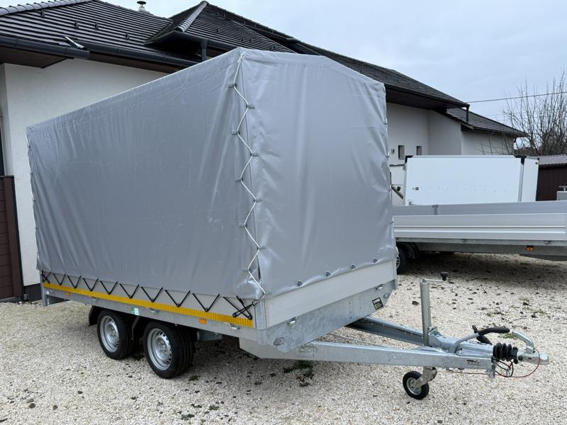 Perem nélküli, sík platós, fa csúszásmentes rétegelt lemezzel borított, trailer, univerzális utánfutó, multitransporter pótkocsi, 30 cm-s eloxált duplafalú alumínium lenyitható, levehető, rugós, csatos, feszítő retesz záras oldalajtókkal, kivehető rakoncákkal, rendszám mögötti rejtett fiókban lévő acél felhajtó rámpákkal, csörlőtartó konzollal, gyári ponyvaszerkezettel, ponyvával.